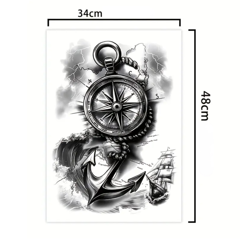 Le tatouage semi-permanent «L’ancre de l’âme» est un chef-d’œuvre en style réaliste organique, représentant un ancre imposante entourée de vagues dynamiques. Conçu pour le dos entier ou la poitrine, ce design spectaculaire exprime la force, la stabilité et la liberté des océans.