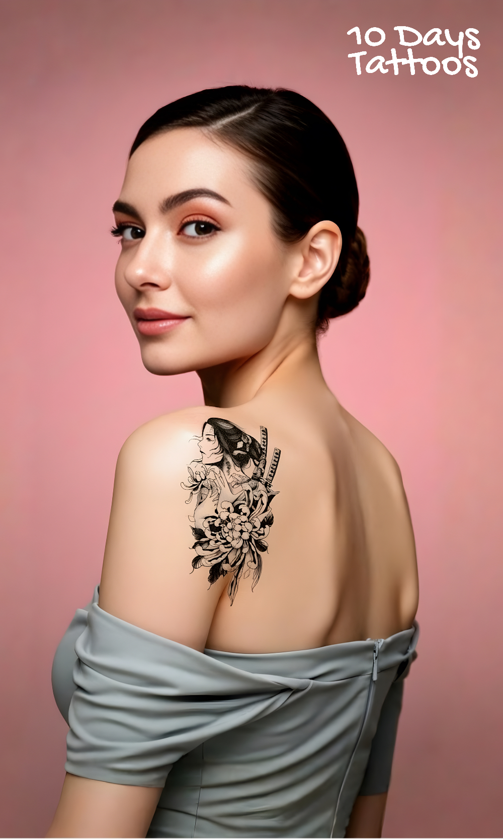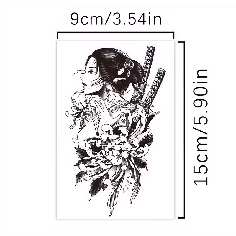 De profil, silencieuse, deux katanas dans le dos et des pivoines à ses pieds — elle n’a pas besoin de se retourner pour impressionner. Ce tatouage neo-japonais (15 x 9 cm) est un hymne à la femme forte et raffinée. Waterproof, mat, jusqu’à 14 jours. Le style n’attend pas.