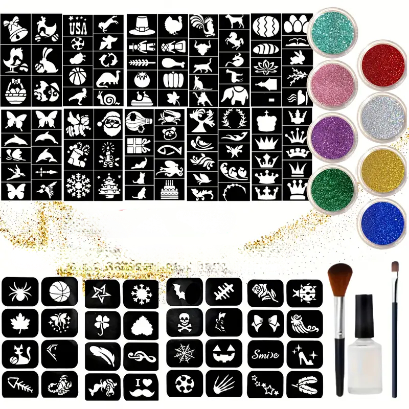 Kit Pochoirs Paillettes Noël – 8 Couleurs, 14 Designs, Colle et Pinceaux, Tatouages Temporaires Fêtes & DIY