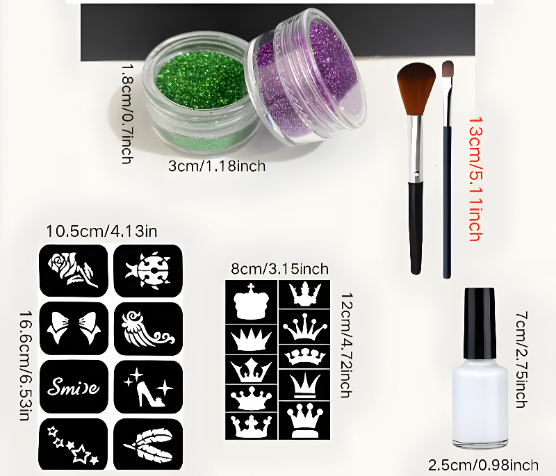 Faites sensation lors de chaque événement avec ce kit complet de tatouages temporaires à paillettes ! Il comprend 8 pots de paillettes lumineuses, 14 pochoirs réutilisables (flocons, sapin, étoiles, animaux…), une bouteille de colle et 2 pinceaux pour une application facile. Parfait pour Noël, Halloween, anniversaires ou soirées déguisées, il fera le bonheur des enfants comme des adultes : customisez le visage, les bras ou les accessoires en 2 minutes chrono. Un must pour toutes les femmes, mamans, collègues ou amies fans de loisirs créatifs, petits budgets et cadeaux ludiques (DIY, animation d’ateliers, panier cadeau surprise…). Waterproof, facile à retirer, résultats glamour garantis pour chaque fête ou selfie !