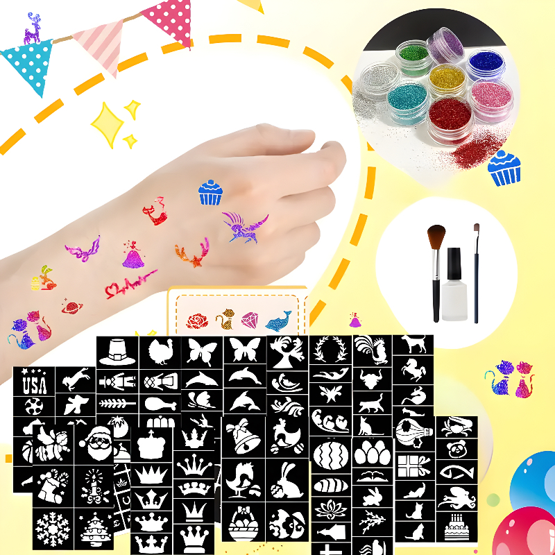 Anime tes fêtes avec ce kit tatouages à paillettes : 8 couleurs, 14 pochoirs originaux, colle et pinceaux inclus. Idéal Noël, Halloween, soirée ou activité créative pour femme, famille, Secret Santa ou DIY malin !