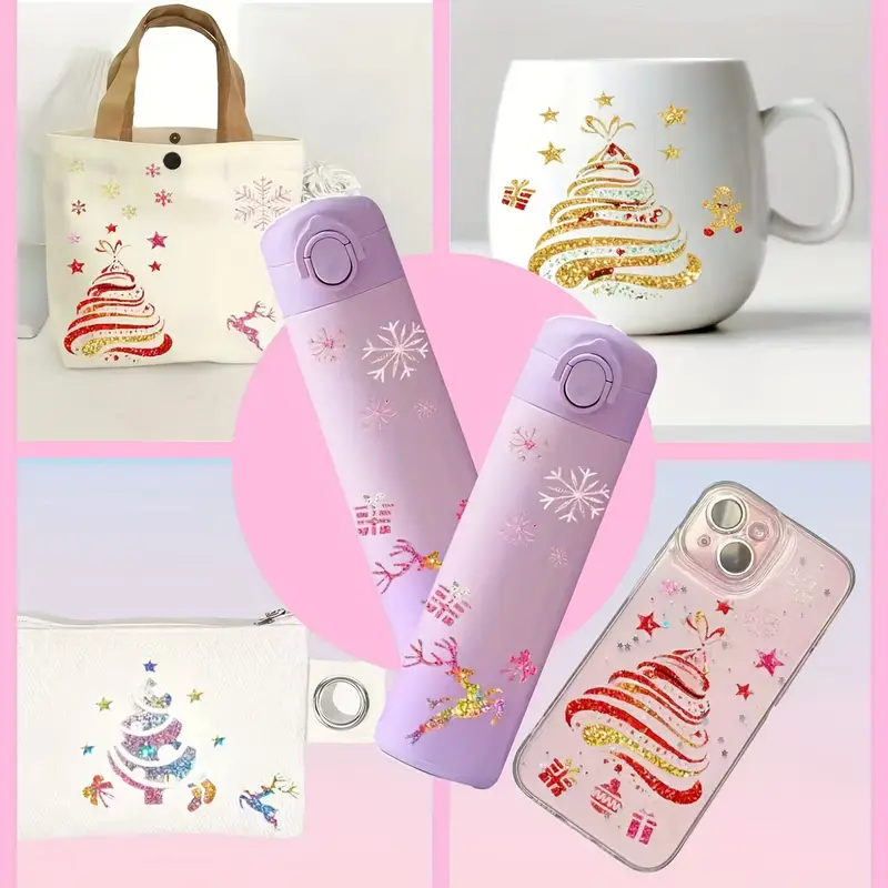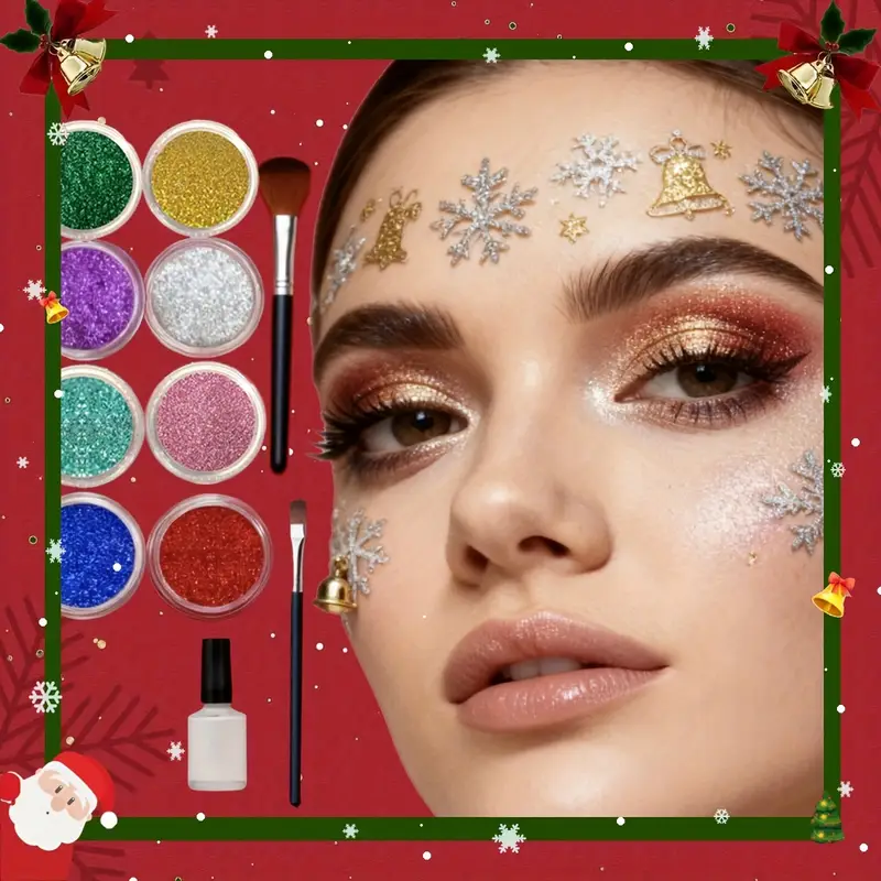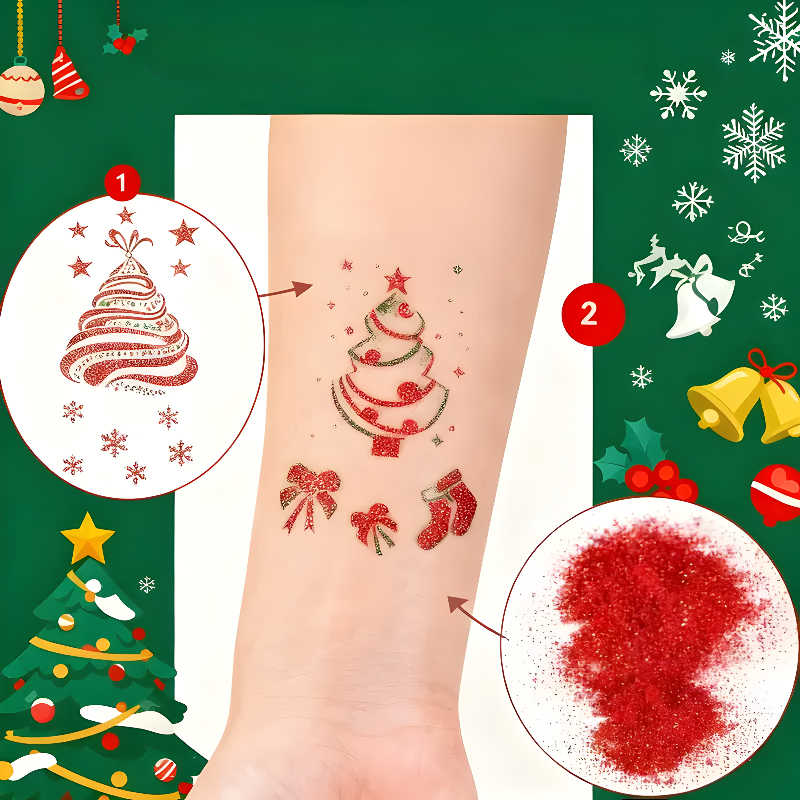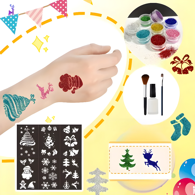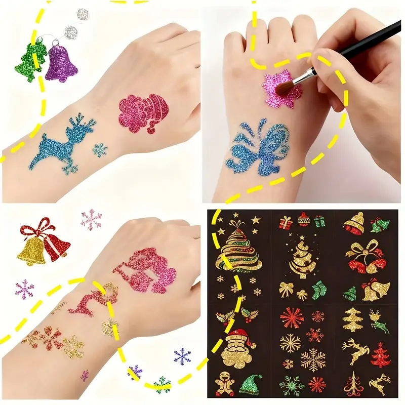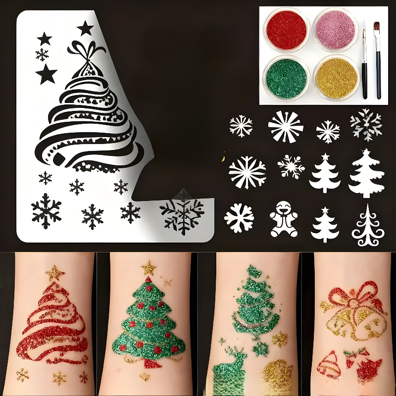 Faites briller les fêtes avec un kit complet : 8 paillettes, 6 pochoirs motifs Noël, pinceaux et gel. Idéal pour des tattoos fun, éphémères et créatifs à Noël, Secret Santa et soirées en famille !
