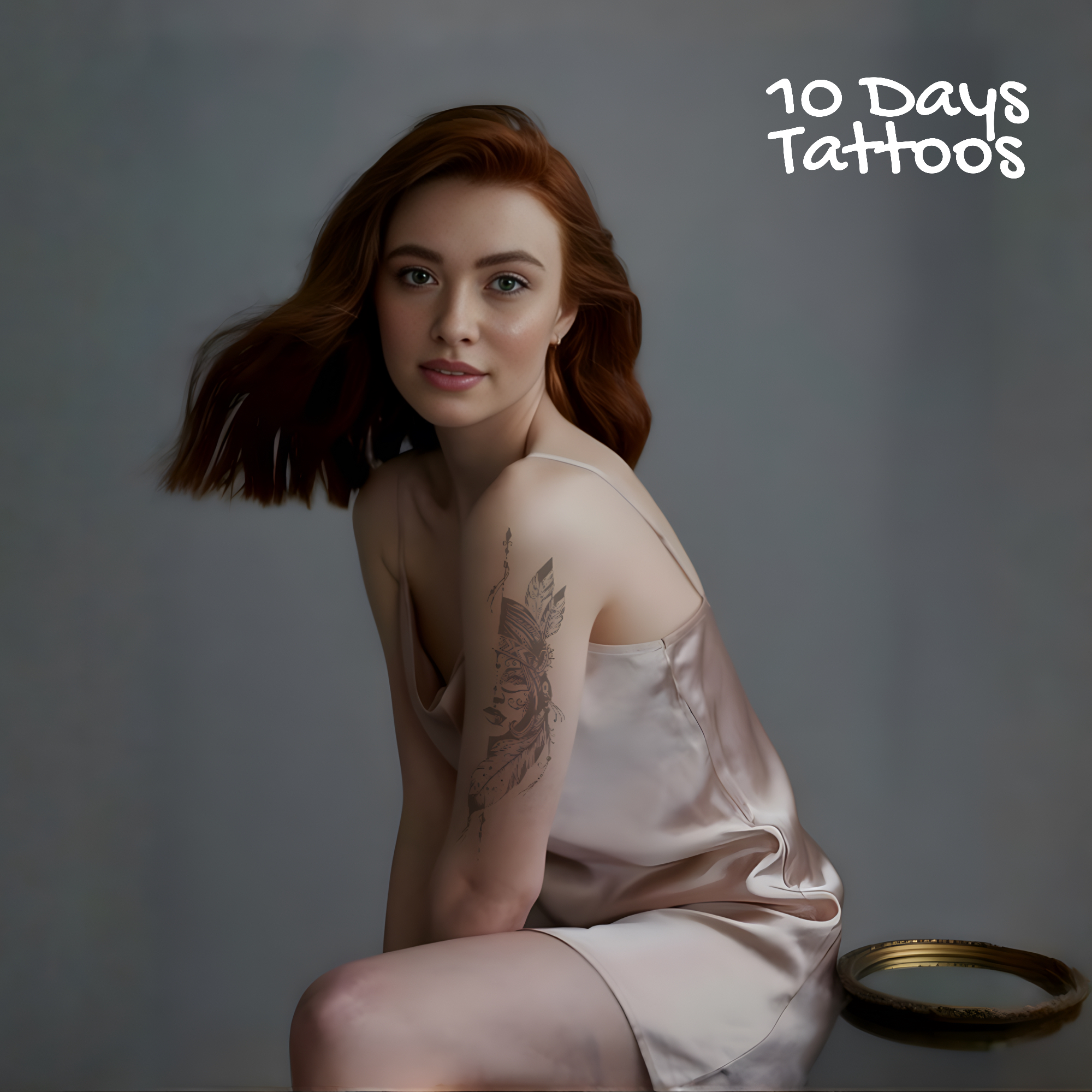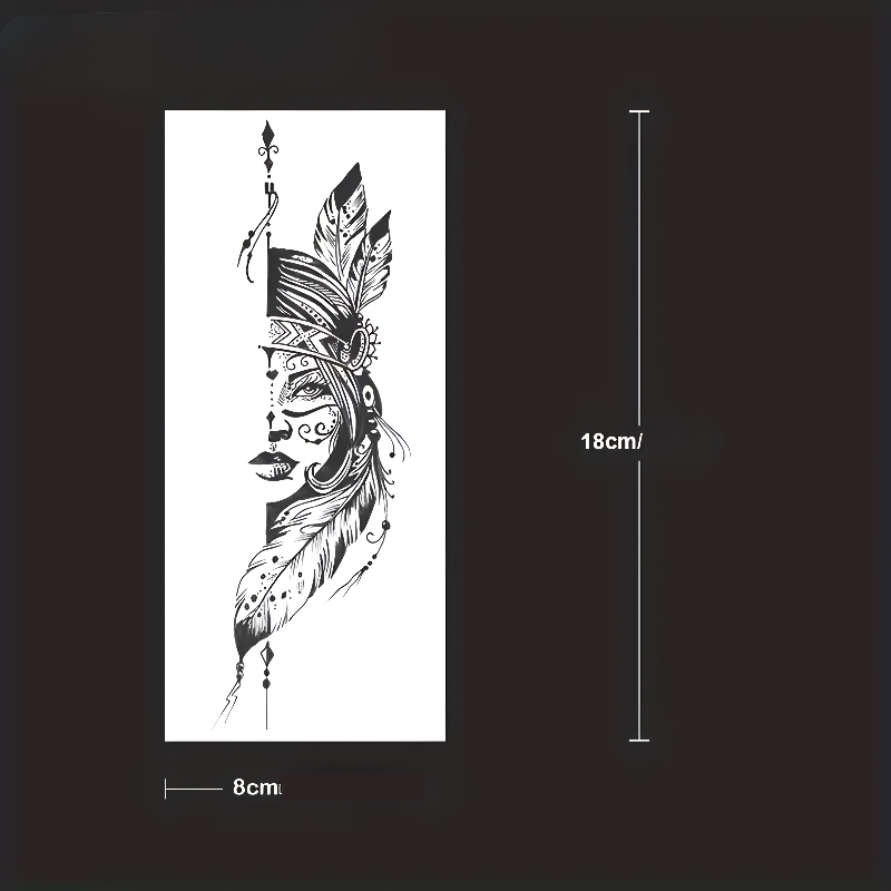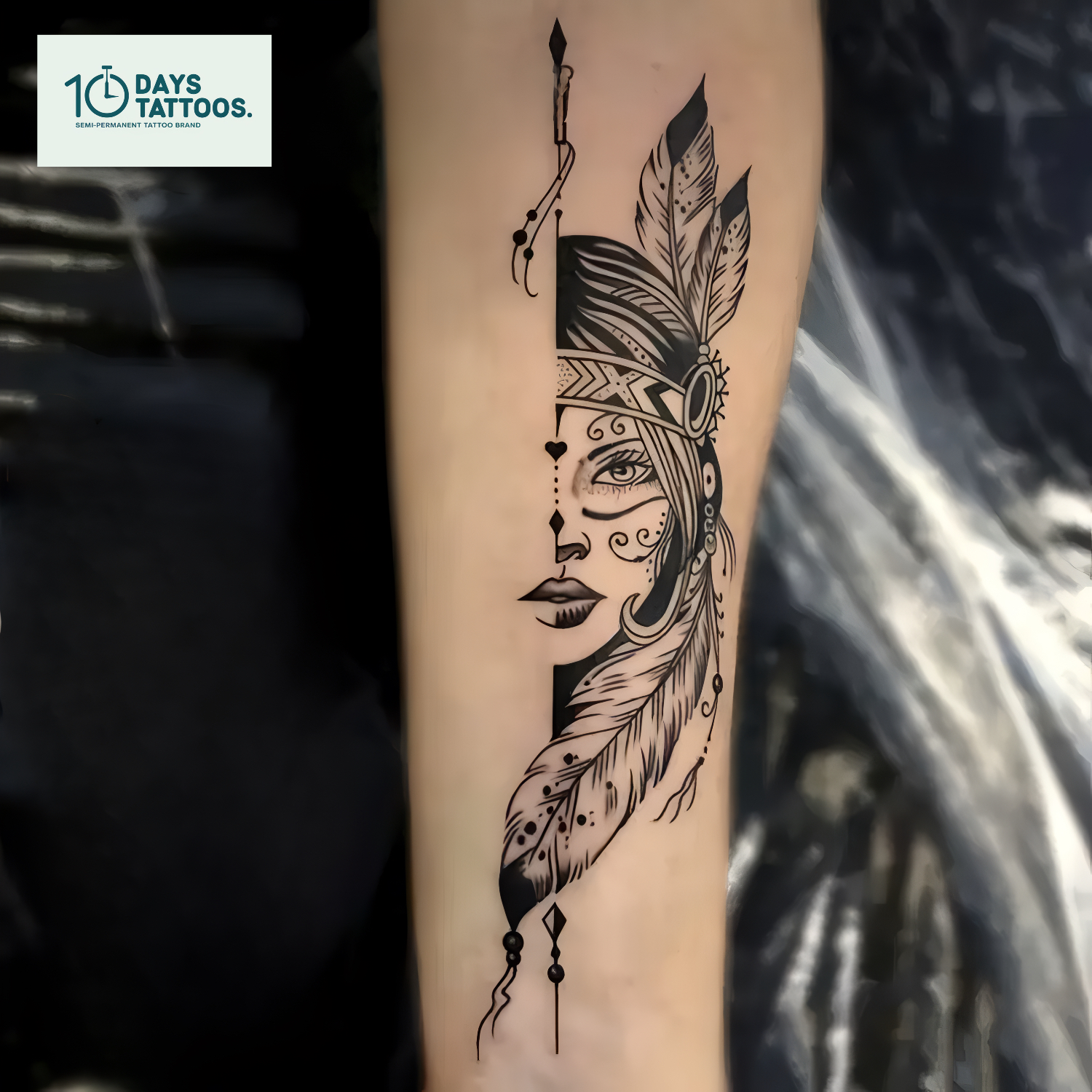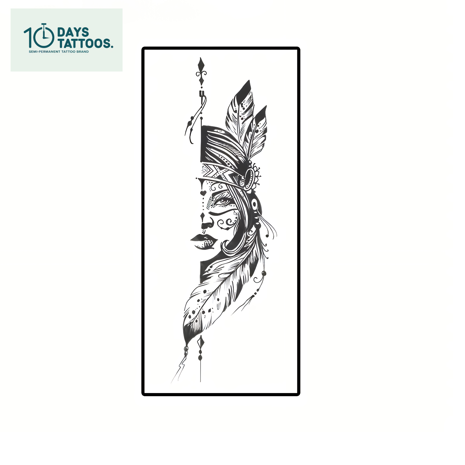 ✨ Le tatouage semi-permanent « L’Esprit de la Plume » est une création élégante qui unit le visage d’une femme orné de motifs ethniques et une longue plume, symbole de liberté et de connexion spirituelle. Placé sur l’avant-bras, ce design reflète la force intérieure, l’harmonie et la profondeur de l’âme.