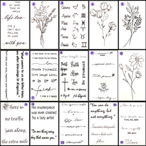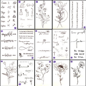 Misez sur l’originalité au quotidien ! Cette collection réunit 30 feuilles de tatouages temporaires waterproof au design art linéaire : motifs minimalistes noirs & marron – cœurs, étoiles, notes musicales, œufs, flèches, écritures, visages joyeux, lèvres et plus encore. Parfaits pour sublimer le corps, le visage ou les mains lors de fêtes, festivals, anniversaires, événements décontractés ou pour un style personnel affirmé.