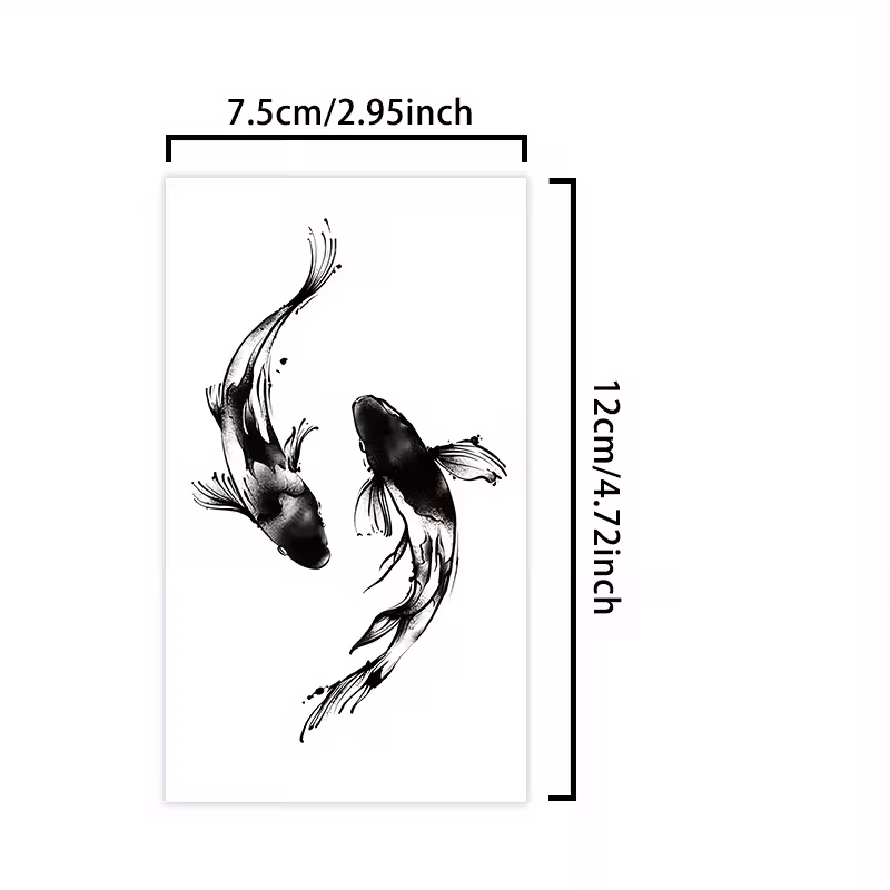 Deux carpes koï qui dansent en miroir, tracées à l’encre comme un souffle de pinceau japonais. Ce tatouage (12 x 7,5 cm) en style sumi-e capture la fluidité, l’équilibre et la persévérance en un seul motif intemporel. Waterproof, mat, jusqu’à 14 jours sur la peau. La chance s’applique en 5 minutes.