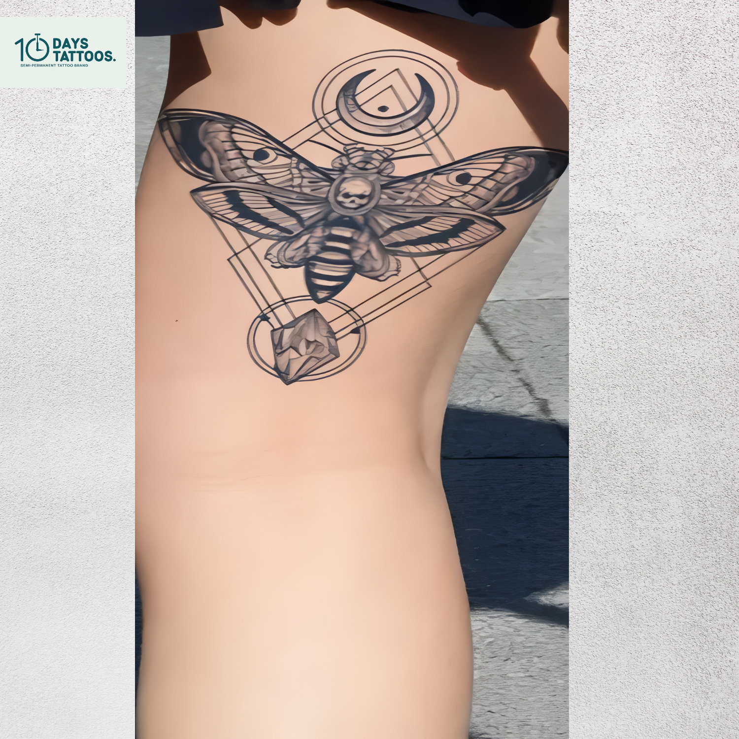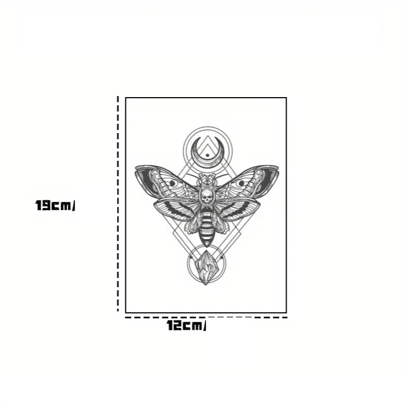 ✨ Le tatouage semi-permanent « La Tania de la Nuit Papillon » est une composition symbolique centrée sur un sphinx (papillon de nuit) détaillé, orné d’un crâne sur le thorax et inscrit dans un motif géométrique harmonieux. Ce design exprime la transformation, la mystique et la force intérieure.