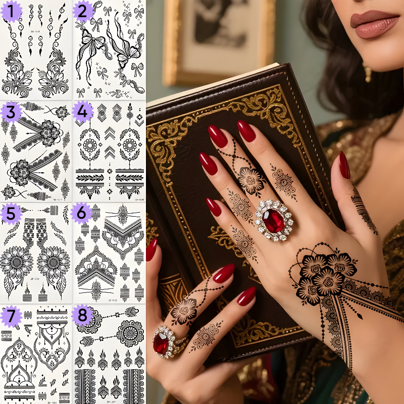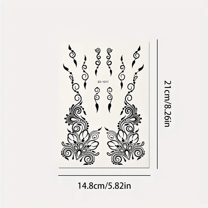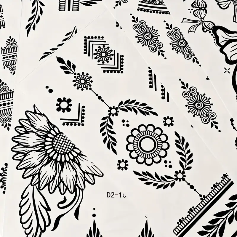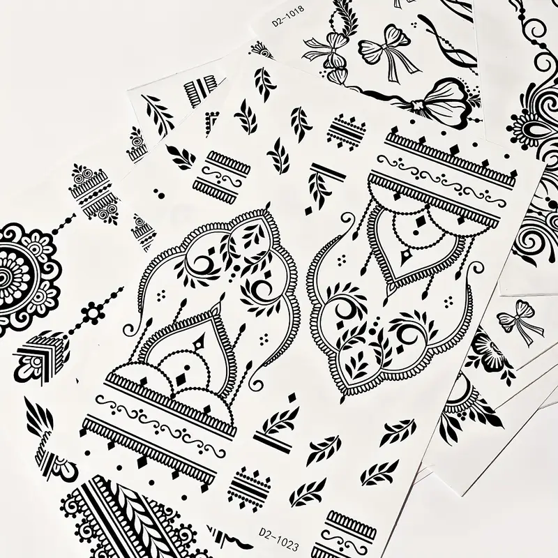 Osez la sophistication avec le choix de 8 feuilles d’autocollants tatouages temporaires noirs aux dessins floraux et ethniques ! Ces motifs raffinés – arabesques, fleurs stylisées, mandalas – se posent en quelques secondes pour habiller bras, jambe ou décolleté d’une élégance affirmée.